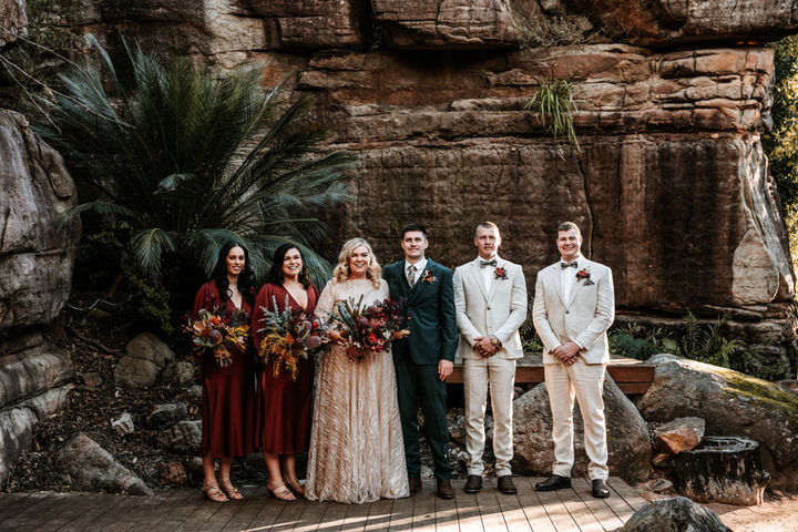 Day One begins as guests settle into the relaxed rhythm of the retreat. Day Two brings your ceremony beneath the eucalypts at the Rock Cathedral, surrounded by fresh green foliage and soft spring skies. After the vows, guests enjoy sparkling drinks and canapés on the Sunset Deck while you slip away for photos among the wildflowers. As evening arrives, the Function Area becomes a warm haven for dinner and dancing — airy yet intimate. The night ends gathered around the Boma firepit, before Day Three unfolds with breakfast, bushwalks, and hugs goodbye under the rising sun.